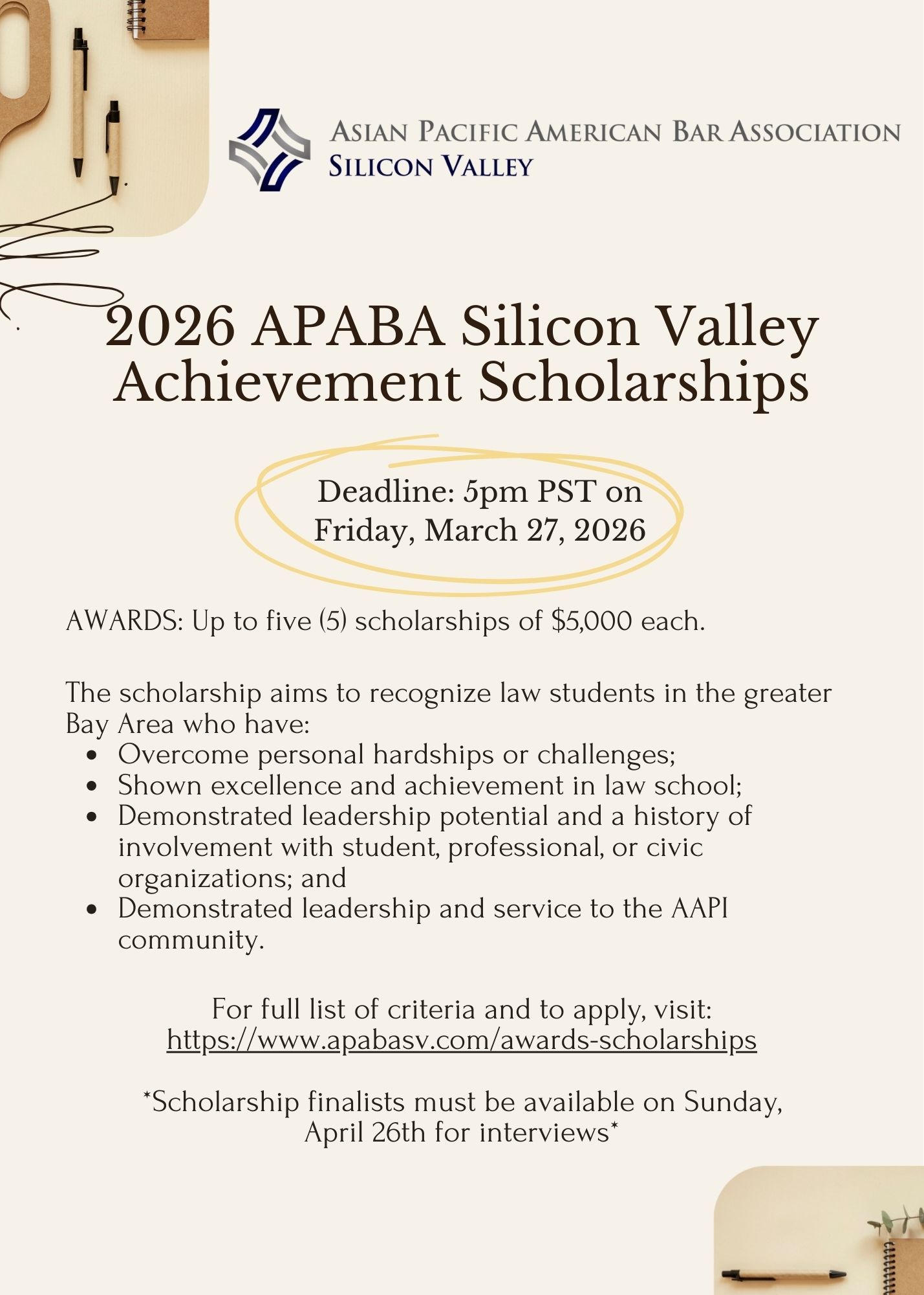 Applications must be received by 5:00 p.m. PST, Friday, March 27, 2026. Please click here for the flyer. Please email your applications to scholarship@apabasv.com.