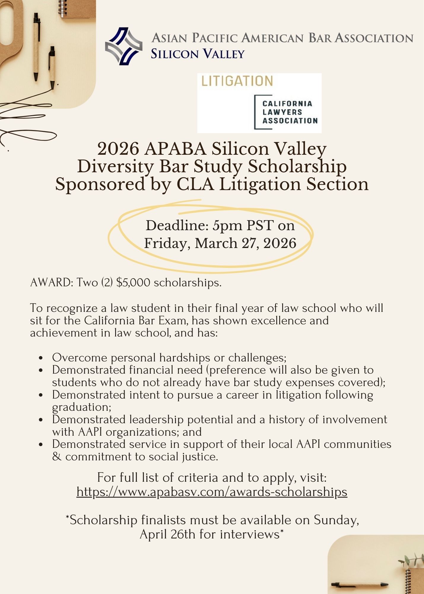 2026 APABA Silicon Valley Diversity Bar Study Scholarship – Sponsored by CLA Litigation Section